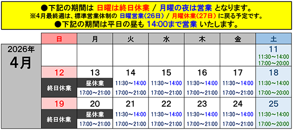 ※臨時休業・営業時間変更などの至急のご案内は、