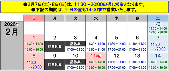 2月7日(土)・8日(日)は11:30~20:00の通し営業となります。 また、2月前半の平日は昼の営業を14:00まで延長いたします。 詳しくは右の営業カレンダーをご参照ください。 ※トラウトサーモン併用は終了、これまで通りシルバーサーモンになりました。